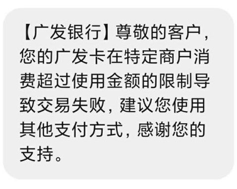 “尊敬的客戶(hù),您的廣發(fā)卡在特定商戶(hù)消費(fèi)超過(guò)使用金額的限制導(dǎo)致交易失敗,建議您使用其他支付方式,感謝您的支持。”