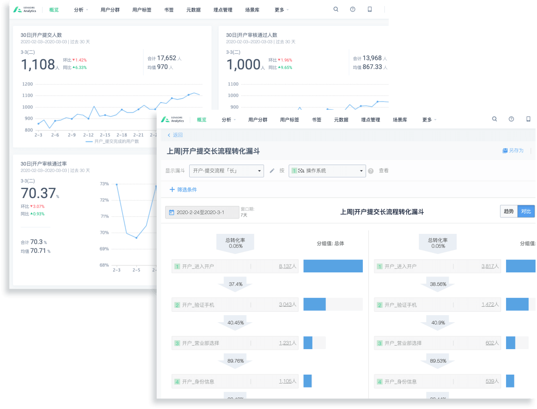 全面采集用戶從抵達落地頁至開戶完成的完整行為序列、與接口性能報錯原因,分析身份驗證/三方存管/視頻驗證/風險測評等環(huán)節(jié)轉(zhuǎn)化,提升新用戶從注冊到開戶的效率。 支持通過應用版本、操作系統(tǒng)版本、手機型號等維度評估流程轉(zhuǎn)化,監(jiān)控流程當中流失率較高的環(huán)節(jié),定位是否存在體驗不佳或是系統(tǒng)兼容性問題,繼而對該節(jié)點進行優(yōu)化及流失人群召回運營,后續(xù)可以繼續(xù)追蹤流失人群的轉(zhuǎn)化效果。